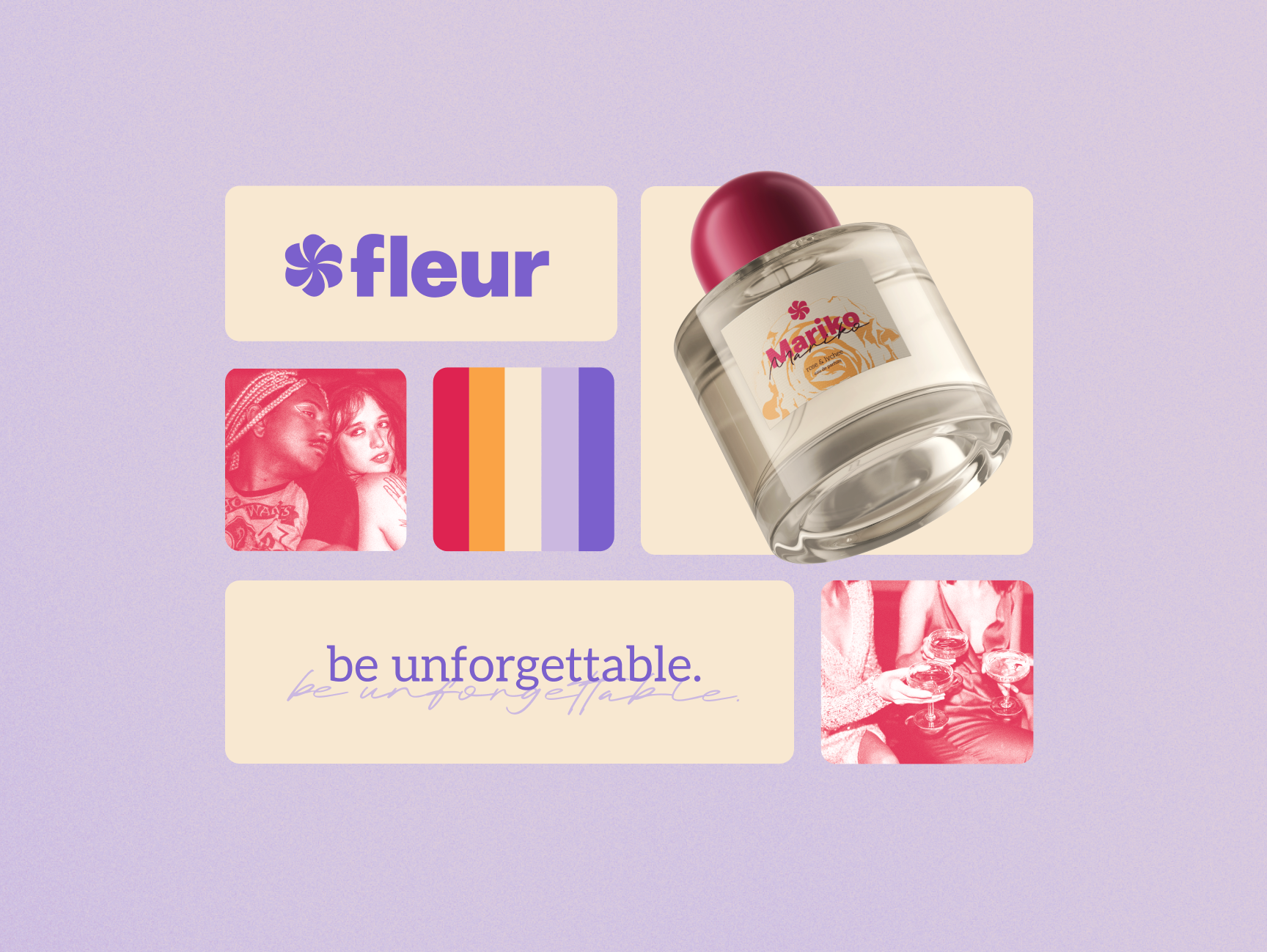 Fleur’s brand concept is inspired by the intimate act of spritzing perfume on a handwritten note, making yourself impossible to forget. This brand concept is brought to life through motifs of stamped imagery, representative of ingraining something into memory, working in tandem with vibrant, striking color. The pairing of bold typefaces with handwritten ones imbues confidence with a personal touch.